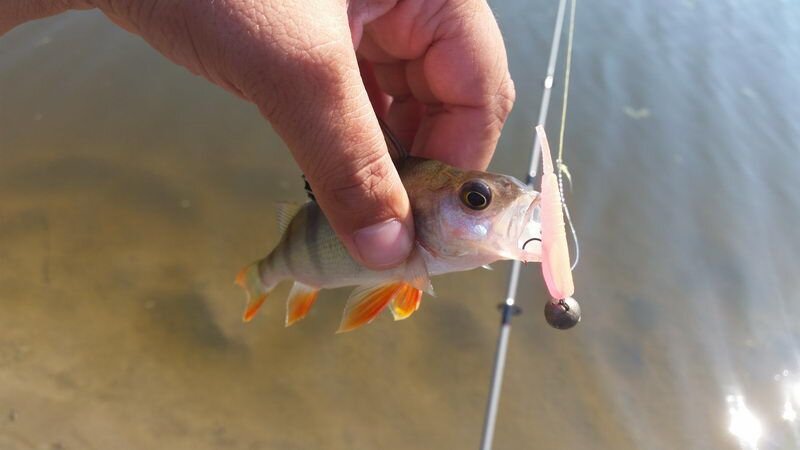 Жара, обед, температура под 30 градусов. Заскочил я протестить силикон Troutino от Lucky John. Выхватил его по дешевке в розовом цвете. Что удивило на первых забросах получил два мощнейших удара, поводок погнули, но рыба не засеклась, потом изловил несколько неплохих окуней и судачки. Под занавес взял еще один микро судачок, но перед берегом сошел.