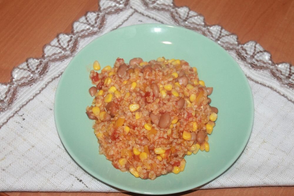 Пожалуй сегодня уже никого не удивишь сочетание продуктом. Взаимосвязь вкусов разных кухонь все чаще встречается не только в высокой кулинарии, но и в повседневной жизни. Отходят в прошлое строгие традиции по разделению блюд по вкусам, сезонности продуктов, способов готовки и тому подобное. Все чаще идет взаимосвязь между культурами и проникновение исконных продуктов одной национальной кухни в другую. Предлагаем вам опробовать один из таких рецептов. Это будет невероятно сытное, богатое вкусом и ароматом блюдо - булгур с фасолью, кукурузой, перцем и томатами. Причем готовим его будем по своему вкусу, а не со стандартной замороженной мексиканской смесью. Ингредиенты: Метод приготовления - тушение Кухня - мексиканская Время подготовки - 20 минут Время приготовления - 30 минут Количество порций - 4 Способ приготовления Подготовить ингредиенты исходя из своих возможностей. Для экономии времени лучше взять замороженную кукурузу и готовые консервированные томаты с фасолью. Булгур за