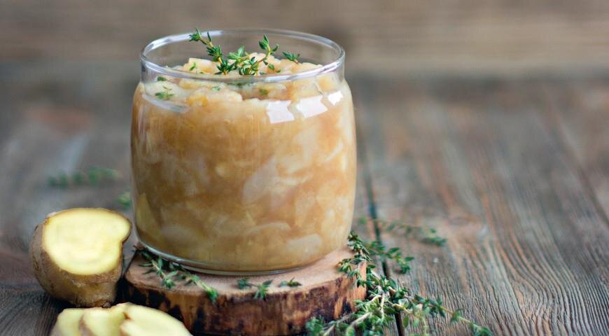 Как только вы приготовите мармелад и попробуете ложечку, вы сразу почувствуете и едва уловимый цитрусовый аромат, и жгучую пикантную пряность имбиря, и обволакивающий теплый аромат корицы и меда, свежие сладковато-острые ноты тимьяна, завершающие эту пряную эйфорию, которая так сочетается с грушей. ИНГРЕДИЕНТЫ 6–7 крупных сладких груш 2–3 см корня имбиря 1 лимон 2–3 ст. л. меда 1 ч. л. корицы несколько веточек тимьяна ПОШАГОВЫЙ РЕЦЕПТ ПРИГОТОВЛЕНИЯ Шаг 1 Возьмите груши, очистите и нарежьте тонкими ломтиками, натрите на мелкой терке корень имбиря, выжмите сок половины лимона и переложите все в кастрюлю с толстым дном. Шаг 2 Доведите до кипения и оставьте томиться без крышки на среднем огне 15–20 мин., периодически помешивая. Шаг 3 В конце добавьте мед, корицу и несколько веточек тимьяна, снимите с огня, закройте крышкой и дайте настояться 10–15 мин. Затем удалите тимьян, остудите и можно подавать.