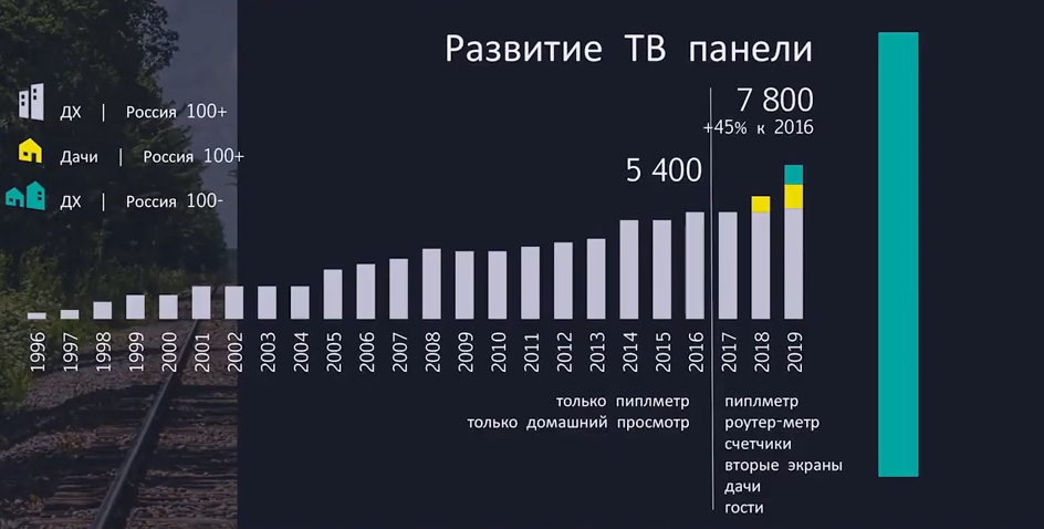 Включение дачного телесмотрения в панель скорректировало традиционный спад зрительской активности в летнее время, поскольку оснащенность загородных домов телевизорами довольно высока: хотя бы один работающий телевизор на даче есть у трети жителей крупных городов. Согласно Mediascope, дачный просмотр дает около 15—20% дополнительного рейтинга летом и около 3% — зимой.