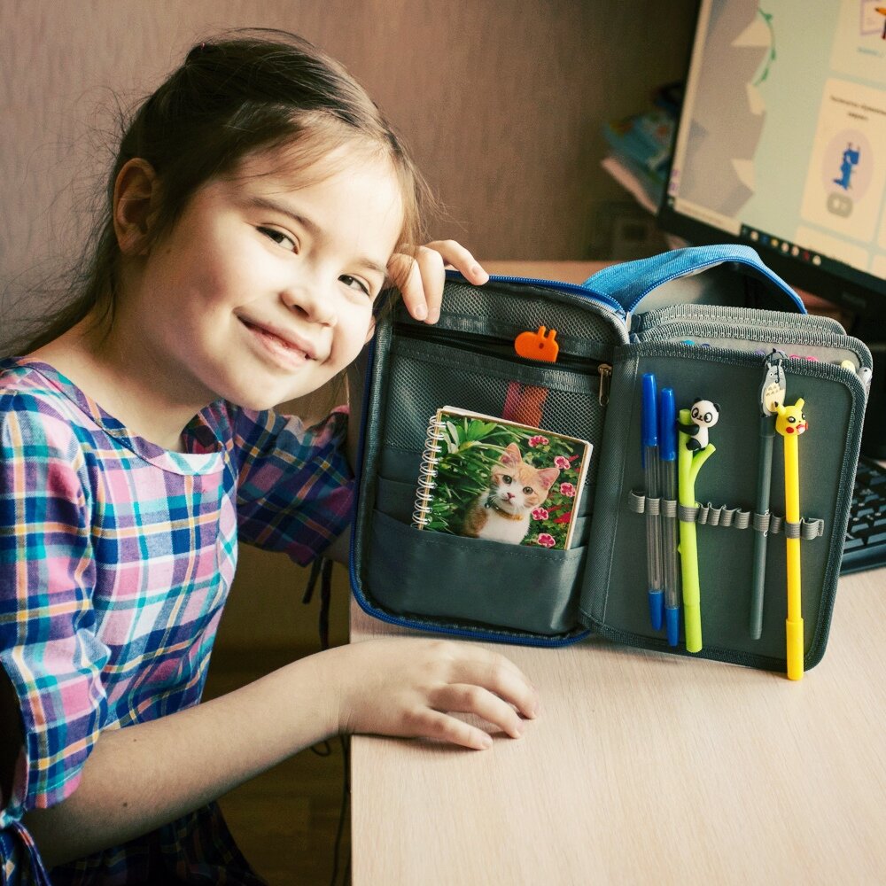 Большой, на 72 карандаша, фломастера, или что у вас там. Лиза положила все самое любимое. Устроен стандартно в виде чемоданчика на молнии с ручкой. Текстильный. Цвета есть разные, Лиза выбрала синий, как ни странно. Сшит пенал отлично, отделки и украшательств на нем нет, все серьезно. На первом развороте накладные карманы на молнии, без молнии и сетчатый отсек. Затем начинаются листы со вставками для карандашей. На первом развороте накладные карманы на молнии, без молнии и сетчатый отсек. Затем начинаются листы со вставками для карандашей. Два последних листа съемные, на липучке. Можно вынуть, если вы в этом пенале вдруг решите нести что-то другое. В общем, пенал отличный, понравился, могу советовать. Напомню, расцветки есть разные, присмотритесь. Ссылка на пенал