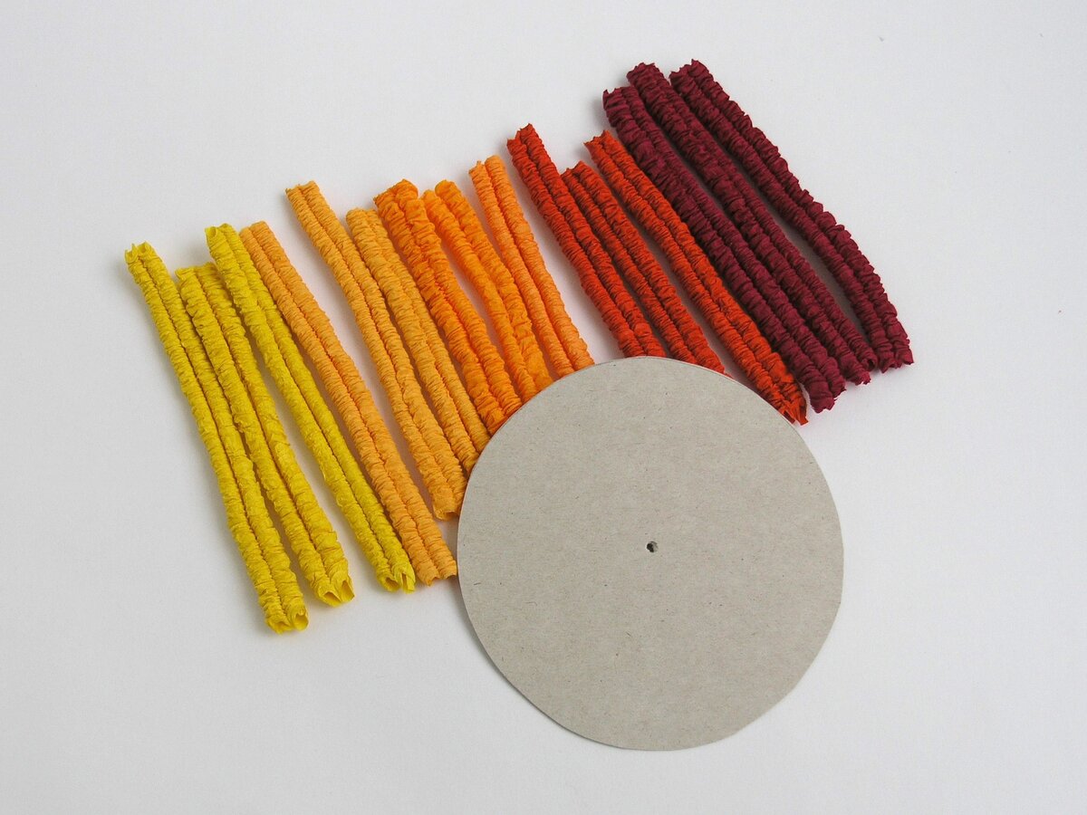 Скоро Масленица! Добавим света и тепла, сделаем солнышко. Накрутим гофротрубочек солнечного цвета. Вырежем из картона круг диаметром 10 см и обозначим у него центр. В центр приклеим жёлтый кусочек трубочки. Оклеим его по кругу одинарной трубочкой. Второй круг будет красного цвета. . Нарежем жёлтую гофротрубочку на отрезки длиной около 1 см. Приклеим их сверху, снизу и по бокам. Затем заполним промежутки. Нарежем оранжевую гофротрубочку на кусочки длиной около 1 см. Капнем клея с одной стороны, сожмём, получится острый уголок. Вклеим треугольнички между жёлтыми отрезками. Вот такое маленькое солнышко у нас уже есть! Оклеим маленькое солнышко красной одинарной трубочкой. Клей наносим на картон и прикладываем трубочки точно на место без сдвига. Второй круг будет бордового цвета. Нарежем из оставшихся трубочек отрезков разной длины, распределим их вокруг солнечного круга. Каждую трубочку с одного конца немного раскроем, а с другого сделаем острой. Капнем клея на край и сожмё