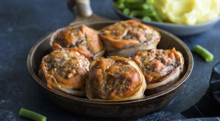 Эти рулеты немного похожи на котлеты, но бекон и пряный соус делают их вкус немного иным. Да и готовить их проще – поставил в духовку, и можно заниматься другими делами ИНГРЕДИЕНТЫ 750 г говяжьего фарша 1 средняя луковица 2 зубчика чеснока 1 большое яйцо 1 стакан молока 1 стакан крошек белого хлеба 1 ст. л. сливочного масла 1 ст. л. вустерского соуса 1 ч. л. сушеного орегано 6 тонких ломтиков бекона 1/2 стакана кетчупа 1 ст. л. коричневого сахара 1 ст. л. горчицы соль, свежемолотый черный перец ПОШАГОВЫЙ РЕЦЕПТ ПРИГОТОВЛЕНИЯ Шаг 1 Разогрейте духовку до 175 °С. Застелите противень фольгой. Очистите и мелко нарежьте лук и чеснок. Шаг 2 Разогрейте масло в сковороде на среднем огне, положите лук и жарьте до мягкости, 5 мин. Немного уменьшите температуру, добавьте чеснок и продолжайте готовить еще 2–3 мин. Снимите с огня. Шаг 3 В большой миске смешайте говяжий фарш, яйцо, хлебные крошки, молоко, вустерский соус, тимьян и обжаренные лук и чеснок. Посолите, поперчите и хорошо перемешайте фарш, разделите на шесть равных частей. Шаг 4 Скатайте фарш в шарики диаметром 6–7 см и слегка приплюсните. Оберните ломтики бекона вокруг фарша. Переложите рулеты на противень. Шаг 5 Смешайте кетчуп с горчицей и коричневым сахаром. Смажьте получившимся соусом верхушку рулетов. Поставьте рулеты в духовку и запекайте 1 ч 15 мин. Подавайте рулеты с картофельным пюре и зеленой фасолью.