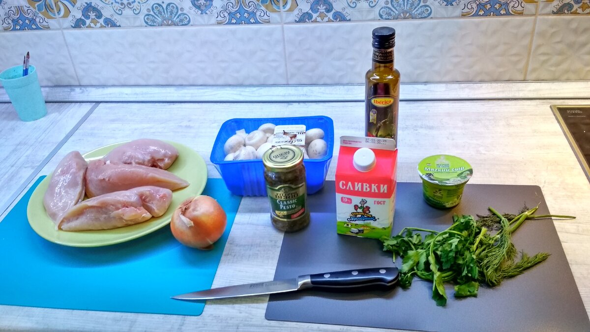 Всем трям! Сегодня наши ошалелые ручки начнут портить курицу! У меня было итальянское настроение и поэтому я решил внести в жизнь ноты далекой жаркой страны. Как всегда, сперва топай в магазин где тебя ждут: Курица ( не пьецца, а курица) филе – 1 лоток Сливки – айн пачк Грибы ( грыбы отсюдова) – 1 лоток Лук – 1 штюк Соус песто ( если хочешь делай сам, но за жертвы я не отвечаю) Мягкий сыр в баночке с зеленью Оливковое масло Зубчик чеснока Итальянские специи Зелень (петрушка, укроп и прочее, что отнимите в поединке с коровой) Итак, вздрогнули припадочные! Режем курицу небольшими кусочками, если резать крупно, то будет сложно жевать и можно повредить жевальник Теперь тоже самое проделываем с шампиньонами и луком. Грибочки нарезай пластинками, а лук мелко покроши. Как немцев под Сталинградом. Далее начни обжаривать грибы и лук. Если они не обжариваются, значит ты не включил плиту. Когда лук станет золотистым, добавь курицу и начни ее обжаривать, равномерно перемешивая Когда курочка пус