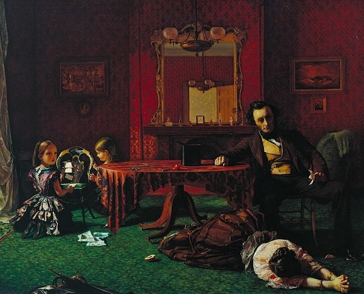 Перед вами драматическая сцена из картины Августа Эгга "Прошлое и настоящее". Хотите узнать как выглядит преддверие распада семьи в викторианской эпохе? Две очаровательные девочки нашли сундучок с мамиными письмами и бумагами. Довольные они копошатся в найденном, пока мама, судя по всему отсутствует. Зато дома был папа, который увидев письма, присел рядом с девочками и стал с интересом рассматривать. Одно из писем оказалось от возлюбленного его жены. Когда жена пришла домой, увидела дочек рядом с разбросанными письмами, мрачного мужа, она все поняла, и в бессилии упала на пол. Мужчина сжимает в руке то самое письмо, разрушившее жизнь его семьи. Одного взгляда на его лицо достаточно, чтобы понять, что он все решил. Пощады неверной не будет. Жена это тоже поняла и горько рыдает на полу, заламывая и царапая свои руки. Девочки притихли, оглядываясь на родителей. Они понимают что произошло что-то ужасное, но что именно им еще предстоит узнать... У картины есть два продолжения, по которым х