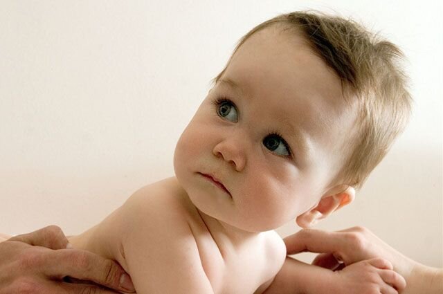 - ребенок сильно потеет, особенно при крике, кормлении или при засыпании. При этом у пота неприятный кисловатый запах, как если бы вы долго не мыли банку после того, как из нее вылили молоко. Пот раздражает кожу, вызывает зуд, появляется потница. В этом случае малыш начинает мотать головкой, трется ею о подушки и вытирает волосики на затылке;