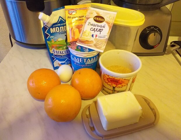 Решила пополнить свою «коллекцию» перевёрнутых пирогов. Сначала был ананасовый, затем яблочный. Сейчас попробую апельсиновый. Мне нравится сам принцип приготовления таких пирогов – всё очень быстро и просто, а результат получается интересный. Ингредиенты: