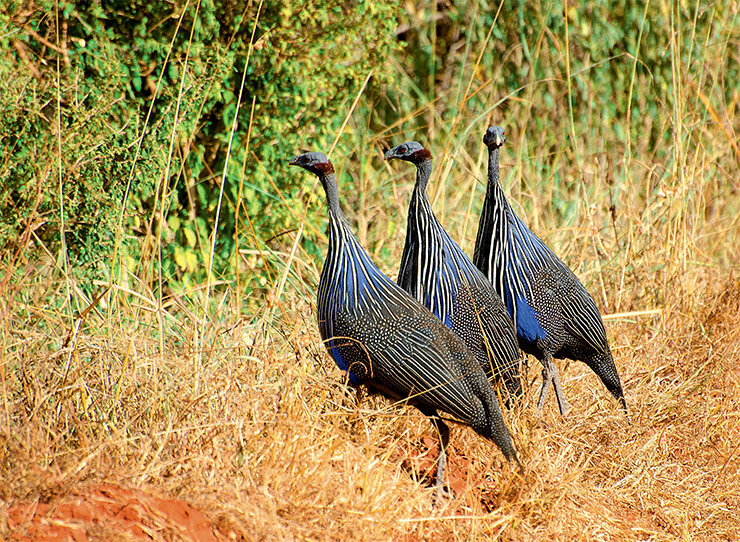 Грифовые цесарки, обитающие в Кении — из тех птиц, что предпочитают бегать, вместо того чтобы летать, и ходить, вместо того чтобы бегать. Подняться в воздух их может заставить только серьезная опасность, палящее солнце или опускающиеся на саванну сумерки. Но даже расправив крылья, цесарка пролетает 50, максимум 500 метров — до ближайшей акации, в ветвях которой птица ночует и прячется от врагов и жары. Чтобы не тратить сил попусту, стая цесарок выставляет дозорного, в обязанности которого входит предупреждать сородичей, занятых поиском еды, о приближении группы хищников или обезьян. Если леопарды, гиены и змеи представляют для цесарок угрозу, то приматы, наоборот, облегчают жизнь — птицы подбирают плоды, которые торопливые обезьяны роняют с деревьев на землю. Цесарки предпочитают питаться фруктами, семенами и мелкими насекомыми, а не падалью, как хищные грифы. С этими птицами грифовых цесарок роднит разве что название и лысая голова. Фото: Марина Мудрова Еще больше интересного