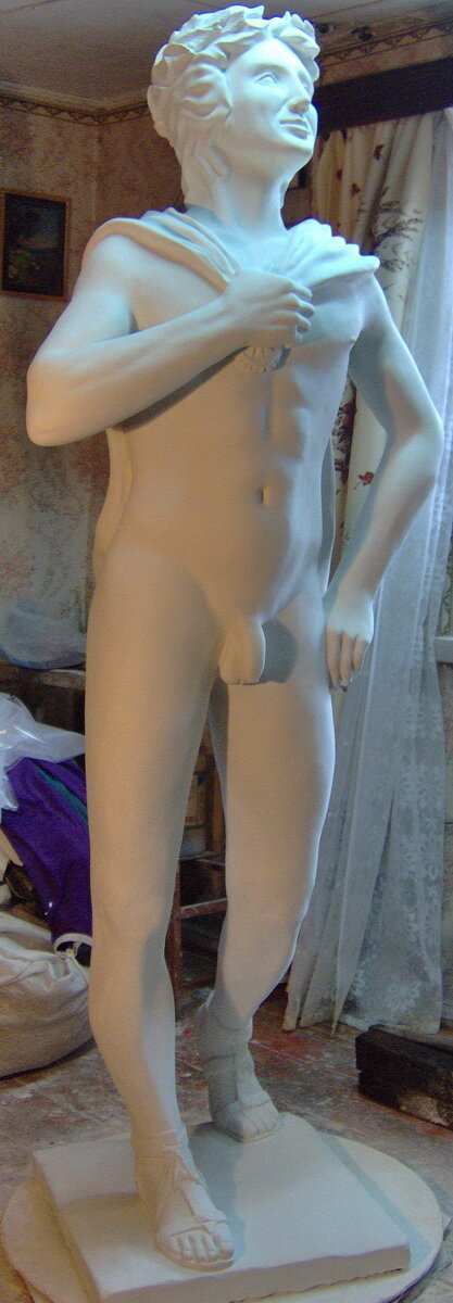 Аполлон - это вторая скульптура, которую мы изготовили на заказ. Первой, конечно же, была Венера – идеал женской красоты и, наверное, самая известная статуя в мире. Наш Аполлон – это нагой юный бог, единственной одеждой которого является короткий плащ, медальон, лавровый венок и римские открытые сандалии. Он, совершенно не стесняясь своей наготы, величественно ступает по земле, надменно подняв голову. В этой скульптуре нет ничего лишнего, простота и изящество – все, что нужно сиятельному, как часто называют Аполлона, божеству. Немного мифологии и генеалогии Аполлона. Отец –Зевс, мать – титанида Лето, сестра – близнец- Артемида. Женат не был, но будучи любимцем женщин, наплодил множество детей, среди которых значатся Еврипид, Пифагор, Янус, Орфей, Асклепий. Всегда юный бог, в обязанности которого входило проезжать на колеснице, запряженной четверкой лошадей по небу, ежедневно освещая Землю. Часто Аполлона сопровождают музы и нимфы. В противоположность Дионису – наруши