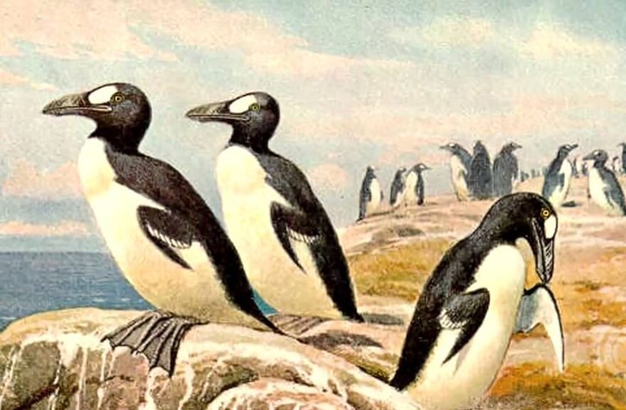 Далее у нас бескрылая гагарка. Она была маленькой, похожей на пингвина птицей, обитающей в Северной Атлантике. Птица откладывала свои яйца на землю, заботясь о том, чтобы размножаться только на определенных необитаемых островах, природный ландшафт которых обеспечивал защиту от стихий и хищников. Бескрылая гагарка достигала до 85 см в длину и весила около 5 кг.