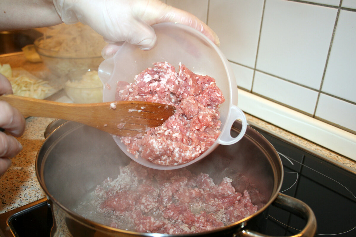 1. Обжарить в кастрюле на растительном масле мясной фарш.
