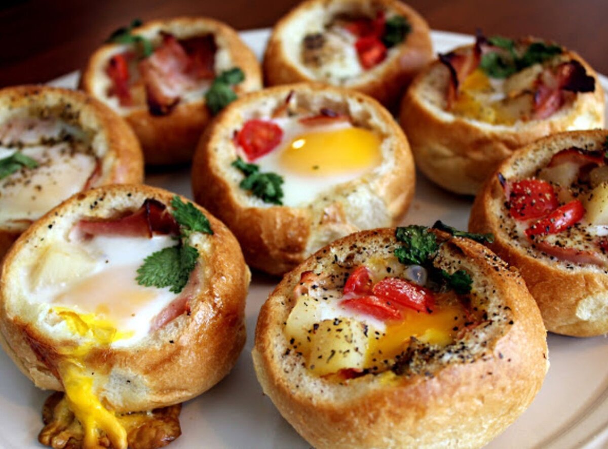 Теперь смазываем внутреннюю часть «хлебного контейнера» мягким сливочным маслом. Можно промазать только дно, а можно и все стороны. Так закуска получится только вкусней и более сливочной. Наполняем наши заготовки начинкой. Мелко шинкуем зелень и посыпаем ею начинку. Теперь в каждую булочку сажаем сырое перепелиное яйцо. Аккуратно укладываем булочки на смазанный маслом противень и отправляем в духовой шкаф (температура нагрева духовки не менее двухсот градусов). Запекаем булочки до тех пор, пока яичный желток не загустеет. Вы можете использовать любую другую начинку! Ароматные хрустящие булочки с сытной начинкой готовы! Приятного вам аппетита.