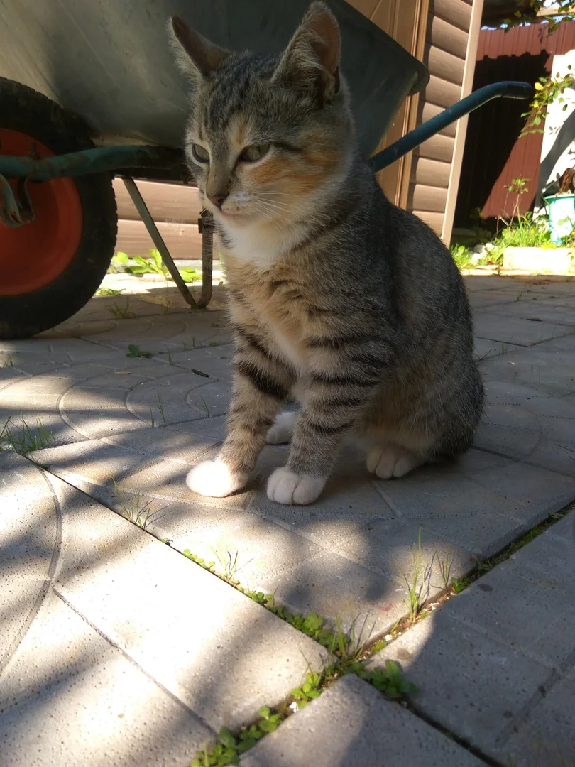 Оказывается кошка, которую мы подкармливали зимой окатилась, а котят привела к нам, мол воспитывайте. В общем, когда мы вернулись на участке разгуливала вся эта семейка. При нашем появлении все котята попрятались, кроме одного. В последствии выяснилось, что это кошечка. Она встала в позу, изогнула дугой спинку и зашипела. Такая маленькая и такая боевая. Она очень быстро сошлась со мной и первая летела за кормом. Первая разрешила себя погладить. Однажды на участок забрела соседская собака. Все котята, включая маму— кошку попрятались, а эта кроха зашипела и пошла на собаку. Собак