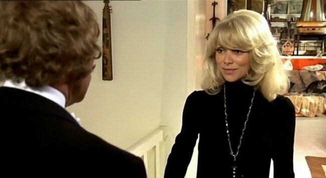 Здравствуйте, уважаемые читатели! В СССР и России актрису Мирей Дарк больше всего любят и помнят по роли красавицы Кристин в суперхпопулярной шпионской комедийной дилогии с Пьером Ришаром «Высокий блондин в чёрном ботинке» (1972) и «Возвращение высокого блондина» (1974). И это неудивительно. Ведь после сцены в черном платье с вырезом забыть актрису просто невозможно. Как она встречает незадачливого скрипача Франсуа Перрена (Пьера Ришара), которого все по ошибке принимают за супер агента? Помните? На героине вроде бы строгое глухое черное платье с высоким горлом и длинными рукавами. Единственное украшение это массивная цепочка с кулоном в форме якоря. Но когда она поворачивается спиной, зритель видит такой вырез, всем вырезам вырез! Перед нами роскошная спина актрисы, оголенная вплоть до самого копчика. На пояснице красуется тонкая цепочка. Однако это не смотрится вульгарно или пошло, это смотрится шикарно. О том, что эта сцена произвела эффект разорвавшейся бомбы, думаю, несложно д