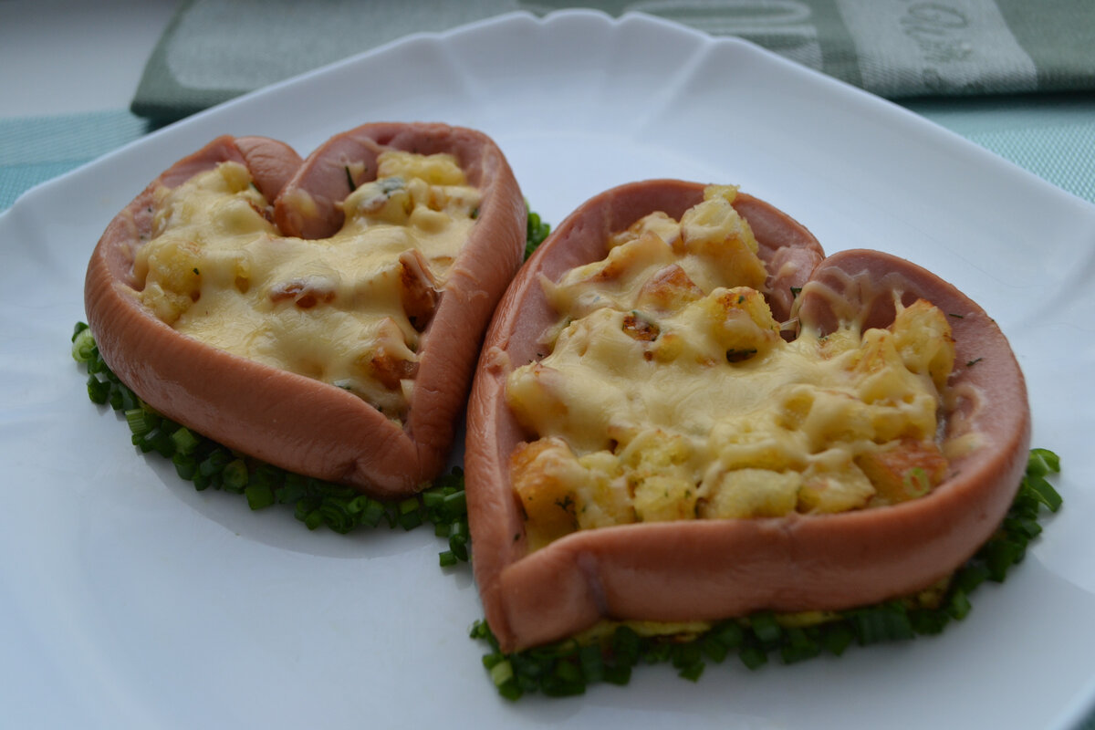 Предлагаю необычный и оригинальный, а самое главное простой способ порадовать своих близких вкусным завтраком. Такой завтрак идеально подойдет ко Дню всех влюбленных и не только! И что может быть приятнее, чем видеть улыбки на лицах любимых тебе людей. А еще такие сердечки однозначно понравятся нашим деткам. Итак, сосиски лучше всего брать тонкие и длинные, их будет удобнее свернуть в нужную форму. Еще нам понадобятся зубочистки, ими мы будем соединять края сосисок. Самое главное потом убрать не забыть :) Сосиску разрезаем пополам. Собираем в виде сердца, соединяем края зубочистками. Яйца взбиваем, солим, добавляем молоко и зеленый укроп. Хлеб нарезаем мелкими кубиками. Теперь необходимо обжарить на сливочном масле нарезанные кусочки хлеба, затем убираем на тарелочку. Затем с двух сторон обжариваем сердечки из сосисок. В середину кладем обжаренные кусочки хлеба, выливаем омлетную смесь, сковороду накрываем крышкой, жарим на медленном огне около 4 -5 минут. Посыпаем натертым н