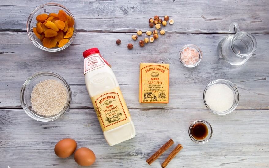 7 шагов для приготовления оригинального лакомства для всей семьи. 1. Подготовьте все необходимые ингредиенты. 2. Залейте курагу кипятком и оставьте замачиваться. 3. В кастрюлю налейте воду, размешайте там 30 грамм сахара и добавьте молоко "Асеньевская ферма". Вскипятите, потом добавьте рис и варите до готовности. После того, как рис будет готов, слейте воду и дайте массе остыть. 4. Разотрите яичные желтки с сахаром и ванильным экстрактом. Добавьте рис и перемешайте, затем добавьте размягченное сливочное масло и еще раз тщательно перемешайте. 5. Белки взбить в густую пену. Курагу нарезать на маленькие кусочки. Добавить все к рису и перемешать. 6. Смазать форму сливочным маслом. Выложить рисовую массу и выпекать в духовке 35 минут при 180°С. 7. Перед подачей можно посыпать пудинг ореховой крошкой и корицей. Приятного аппетита!