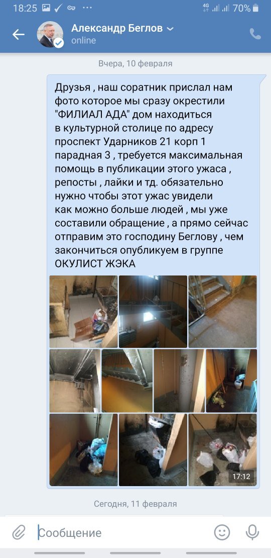 ЖКХ или "ФИЛИАЛ АДА" закрыт Вчера бравые парни из группы ОКУЛИСТ ЖЭКА опубликовали пост о ужасающем состоянии парадной №3 по адресу проспект Ударников 21 корп 1 , также пообещав отправить данный пост губернатору Санкт-Петербурга господину Беглову , что они собственно и сделали Вот фото и текст Друзья , наш соратник прислал нам фото которое мы сразу окрестили "ФИЛИАЛ АДА" дом находиться в культурной столице по адресу проспект Ударников 21 корп 1 парадная 3 , требуется максимальная помощь в публикации этого ужаса , репосты , лайки и тд. обязательно нужно чтобы этот ужас увидели как можно больше людей , мы уже составили обращение , а прямо сейчас отправим это господину Беглову , чем закончиться опубликуем в группе ОКУЛИСТ ЖЭКА А уже сегодня они получили ответ от губернатора Друзья это в очередной раз доказывает что их благое дело работает , хочется отметить быструю работу губернатора Беглова по данному вопросу , то что не могли решить годами он решил меньше чем за сутки. Особенно