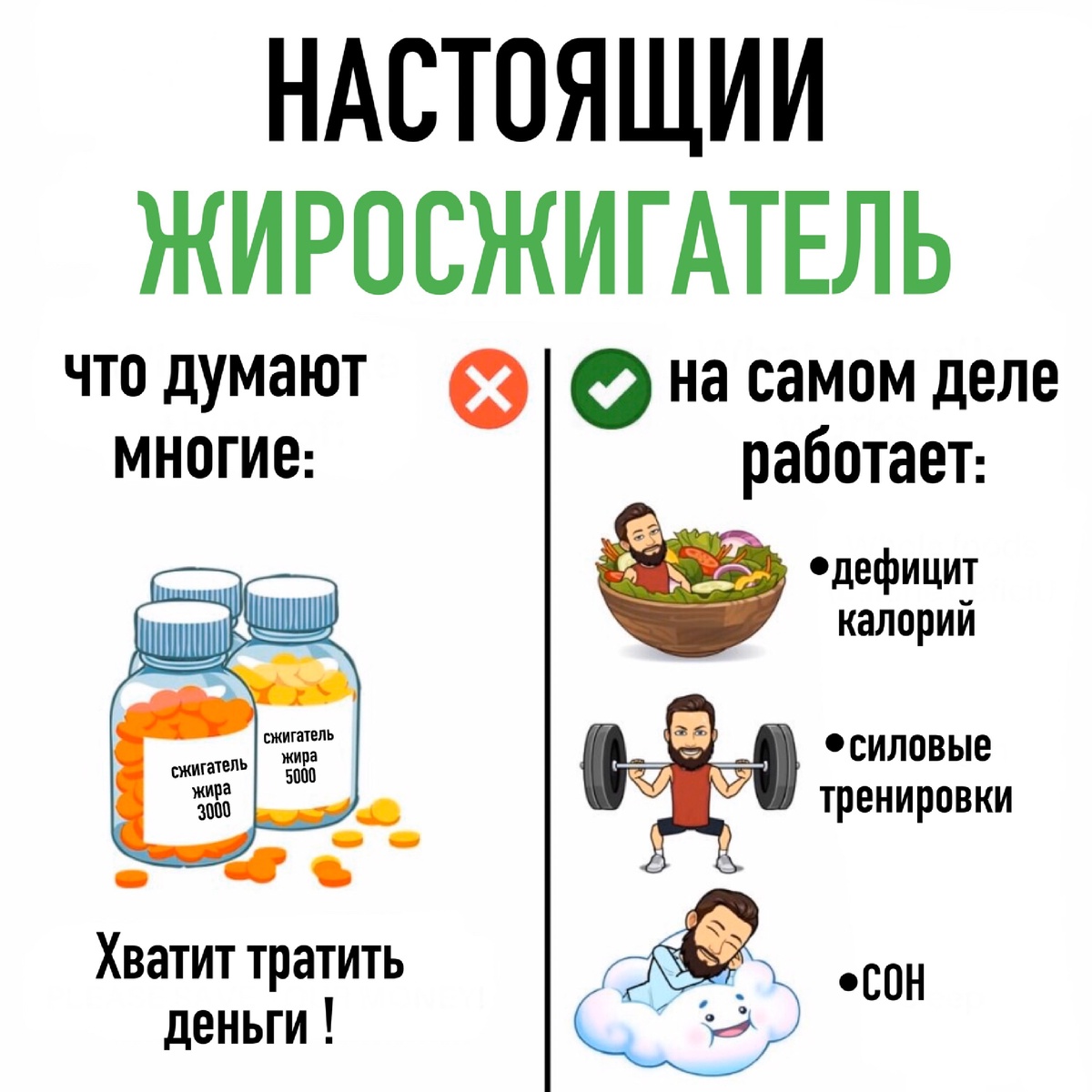 Нет ни одного продукта, который бы волшебным образом сжигал жир. Чтобы сжечь жир, нужно создать дефицит калорий и придерживаться с течением времени такой тактики. ЭТО ЕДИНСТВЕННЫЙ СПОСОБ, СЕРЬЕЗНО 😅 Самый простой способ: сосредоточиться на цельной пище, регулярно тренироваться и хорошо спать 🙌🏻 Ставь ❤️ и применяй данный совет 💪🏻