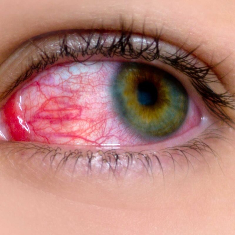 Возникает по причине не плотного смыкания век, куда попадают испарения клея для наращивания.