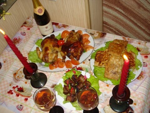 Или любимую - мужчины ведь тоже умеют готовить! День Святого Валентина через пару дней! Я не против этого праздника и никогда не брюзжу по поводу "не наш" - какая разница, что праздновать, если есть повод для радости? Но по сути для приготовления романтического ужина можно и не ждать 14 февраля, а можно дождаться и 23 фвраля или 8 марта даже (для мужчин). А иногда нужно просто - приготовить романтический ужин и порадоваться вдвоем, отправив детей к бабушкам (если таковые уже имеются)! Самое простое конечно - испечь печеньки в форме сердечек либо заливное приготовить в таких же формочках. Но если вкладывать в этот вечер глубинный и несколько эротический счмысл - одними сердечками мужчина сыт не будет! На этот случай можно приготовить несколько простых и вкусных блюд - возможно романтикам, умеющим готовить, мои идеи пригодятся! Для начала - несколько правил романтического (а, возможно и эротического) ужина: "Эротический ужин – это легкий, изящный, красиво оформленный стол, но при это