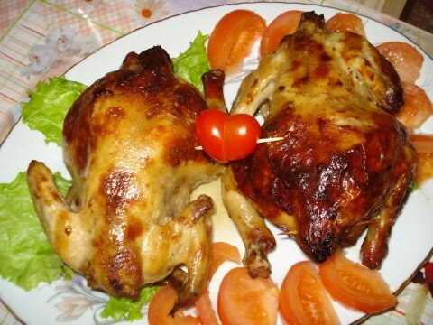 День Святого Валентина или другой какой значимый день для двоих влюбленных эти цыплята несомненно украсят! Единственный момент - цыплят к приготовлению надо подготовить накануне вечером,но это даже удобно - в день праздника останется совсем немного - только запечь! Состав: маленькие цыплята весом 500-700гр. – 2 шт. , а так же всего остального тоже по 2 шт. - перец болгарский , помидоры, лук репчатый, чеснок, соль – 2 ч. ложки, любимые специи по вкусу. Овощи (за исключением чеснока) разрезать на 4 части и обжарить до полуготовности на растительном масле. Посолить тушки цыплят изнутри и внутрь положить очищенные зубчики чеснока и все обжаренные овощи. Скрепить отверстия зубочистками. Посолить тушки снаружи, натереть специями, уложить в емкость, придавить грузом и отправить на ночь в холодильник. Запекать цыплят в заранее разогретой духовке при температуре 200 С. В принципе гарнира к данному горячему блюду не требуется - гарнир из овощей ведь внутри каждого цыпленка! Приятного