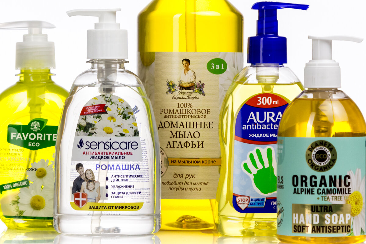 Жидкое мыло прочно вошло в наш обиход как альтернатива кусковому. Оно удобное, экономичное, к тому же, можно использовать собственный красивый флакон. Остается только разобраться в том, есть ли разница между средствами разных брендов и имеет ли значение стоимость? В испытаниях приняло участие жидкое мыло с ромашкой следующих брендов: Aura, «Рецепты бабушки Агафьи», Favorite ECO, Sensicare, Planeta Organica ECO. С балансом все в порядке Показатель pH (водородный показатель) крайне важен для всех средств, соприкасающихся с кожей. Тем более для мыла, которое мы используем много раз в день. По ГОСТу pH жидкого мыла может быть 5,0-8,5, а по Техническому регламенту Таможенного союза «О безопасности парфюмерно-косметической продукции» допустимы колебания в более широких пределах — 3,5-8,5. Результаты испытаний показали, что все проверенные образцы имеют показатель pH, вписывающийся в допустимый стандартом диапазон — от 5,7 до 6,5. Чем больше пены, тем чище руки? Пенообразующая способнос