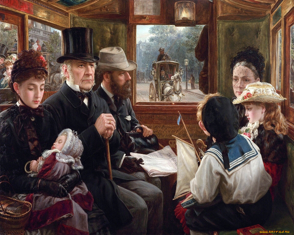 Картина выше это "Поездка на омнибусе в цирк Пикадилли". Прекрасное произведение не правда ли? Автором её является великолепный британский живописец Альфред Морган (1835 - 1924 г.). Человек закрытый и в тоже время весьма эксцентричный. Ну вроде бы затворники предпочитают не привлекать к себе внимание, да? Обычно да, но иногда получается наоборот, по целому ряду причин. Художника Альфреда Моргана очень часто путали (и сейчас бывает) с другим британским живописцем Фредериком Морганом - портретистом, анималистом, певцом сельской жизни. Манера рисования у них несколько похожа, да ещё родились и умерли они примерно в одно время, а значит блистали на творческой арене синхронно. Из-за фамилии, им там даже было несколько тесновато. Всё это порождало путаницу среди любителей живописи и раздражение Альфреда, который был не настолько продуктивен, но сильно обижался когда его путали с Фредериком. Представьте, что на выставку Альфреда приходят любители пастушек, сельских пейзажей с простеньким со