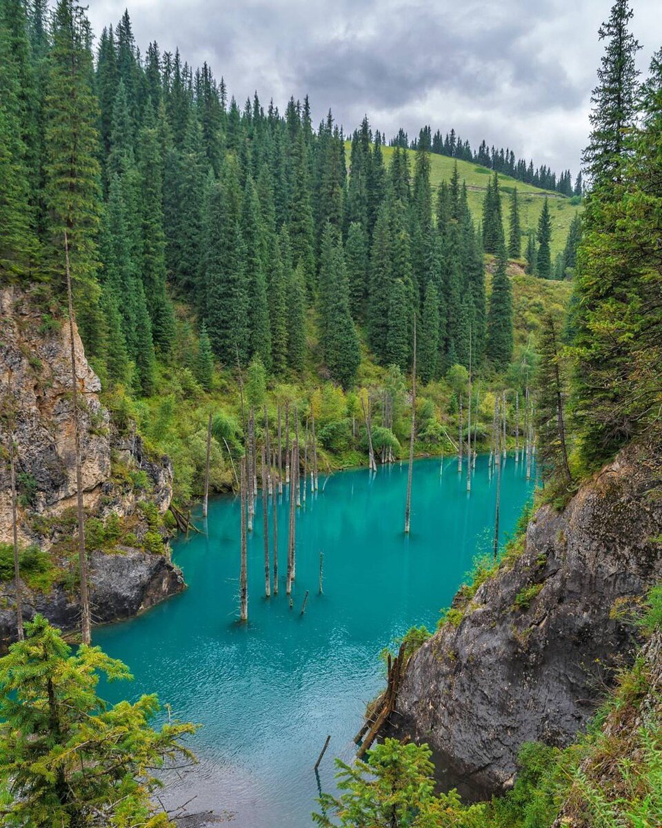 Необычное озеро с прозрачной водой и деревьями, будто растущими из него. Территория окружена горами и елями. Вода в озере меняет цвет от синего, бирюзового до коричневого, в зависимости от погодных условий.