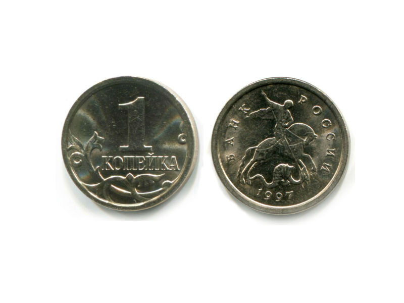 В России после деноминации 1998 года в обращение вернули монету номиналом в 1 копейку. Конечно её выпуск был не выгоден для государства, но при расчетах в магазинах и банках требовалась точность на уровне одной копейки. Копейка 1997 года была выпущена заранее за год перед деноминацией, но в оборот попала только 1 января 1998 года. Реверс В середине сдвинутая вправо и вверх цифра «1», обозначающая достоинство монеты, ниже надпись «КОПЕЙКА». Внизу, слева и справа завитки растительного орнамента. Аверс В левой части по дуге канта расположено слово «БАНК», а в правой части слово «РОССИИ». Ниже указан год выпуска «1997». В центре монеты изображён Георгий Победоносец, убивающий змея копьём. Под передним копытом коня обозначение монетного двора "С-П" (СПМД) или "М" (ММД). Гурт Гладкий. Страна: Российская Федерация Вес: 1.5 гр. Металл: Железо (Сталь) Обозначение: Fe(*) Плакирование: Мельхиор Информация о монете Номинал: 1 копейка Денежная единица: Копейка Литеры: М или С-П Чекан: Регулярный че