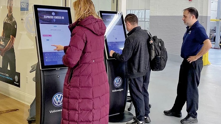 Дилерские центры Volkswagen в Бостоне и Пасадене используют интерактивные киоски для приемки автомобилей клиентов на сервисное обслуживание. Volkswagen внедрил виртуальные киоски для приема автомобилей в двух своих дилерских центрах, которые позволяют клиентам записаться на обслуживание автомобиля за менее чем три минуты, если на стойке по приемке автомобилей образовалась очередь. Этим летом Volkswagen установит обновленную версию сенсорных киосков, которые будут не только вести запись на прием и принимать оплату за сервисные услуги, но и сдавать и возвращать автомобильные ключи. Данная функция терминалов самообслуживания позволит полностью автоматизировать ночную приемку и выдачу автомобилей на сервис в большинстве дилерских центров. Volkswagen является последним автопроизводителем, который начал экспериментировать с цифровыми киосками в дилерских отделах сервисного обслуживания, чтобы привлечь занятых клиентов, которые не могут долго стоять в очереди к консультанту или