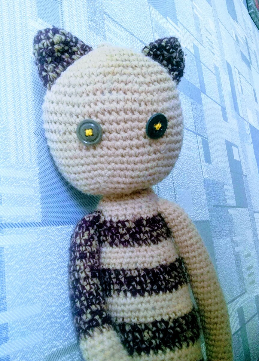 🐱Этого котика в технике амигуруми я связала из остатков пряжи. Поэтому сказать, какую именно пряжу я использовала, не могу. Единственное, это то, что она очень мягкая и по составу похожа на хлопок. Вяжется котик очень легко, т.к. состоит преимущественно из длинных прямых деталей (руки, ноги, хвост). 🐱Котик получился о-о-о-очень длинный, около 70 см. Его можно было бы назвать сплюшкой, но глазки-пуговки не позволяют это сделать. Но в кроватке поселился сразу. Он мягкий благодаря пряже и набивке из синтепона. Бывает, что дочка засыпает прямо на нём. 🐱Схему для вязания котика я использовала из этого видео. Спасибо автору за работу, мне за исполнение и вам за 👍