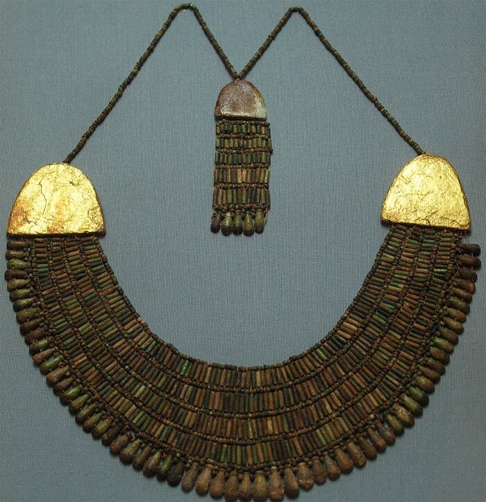 Вероятно, одним из самых знаковых древнеегипетских ювелирных украшений, которое вы наверняка видели в фильмах, было широкое ожерелье с воротником, которое располагалось на ключицах. Ниже приведен пример такого ожерелья из медной и золотой фольги, найденный на месте захоронения египтянина. Считается, что ожерелье датируется концом 5-ой династии или началом 6-ой династии.