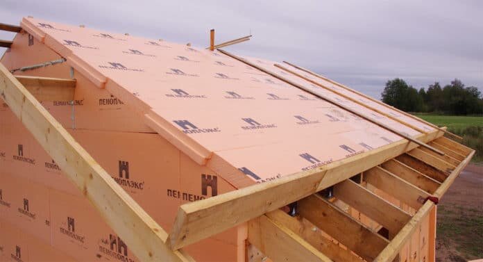 - Утепление потолка каркасного дома, когда сделана обвязка, возведены стены, выполняется из современных материалов. Они представлены в разных ценовых категориях, структура материалов разная. Самой востребованной считается минеральная вата в плитах. Строители часто используют в работе пенопласт, пеноплекс и другие подобные ему изоляторы. Минеральная вата представляет собой теплоизолирующий материал, который продается в рулонах и в матах. Монтаж сделать очень легко, но вата должна быть закрыта пароизоляцией. Если отделка будет сделана некачественно, то материал будет быстро впитывать влагу. Пенопласт тоже представляет собой недорогой материал, который можно купить практически в любом строительном магазине. Он почти не поглощает влагу, в процессе укладки между потолочными балками необходимо использовать монтажную пену или герметик в больших количествах. Важно тщательно заделать все щели и стыки. Отделка из пенопласта отличается тем, что плиты очень легко уложить. Строители часто используют для утепления каркасных домов пеноплекс. Он обладает великолепными теплоизоляционными характеристиками, поэтому отделка может быть выполнена меньшим слоем. Производитель заявляет, что достаточно 50 мм. Пеноплекс не гигроскопичен, то есть он не втягивает в себя влагу из атмосферы. Среди недостатков материала можно назвать те, которыми обладает и пенопласт, но стоимость пеноплекса выше.