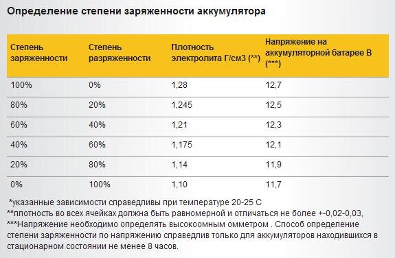 Проводится измерение при температуре +20…+25 °С, у полностью заряженной батареи 12,7 — 12,9 Вольт, и не раньше чем 8 часов после остановки двигателя.