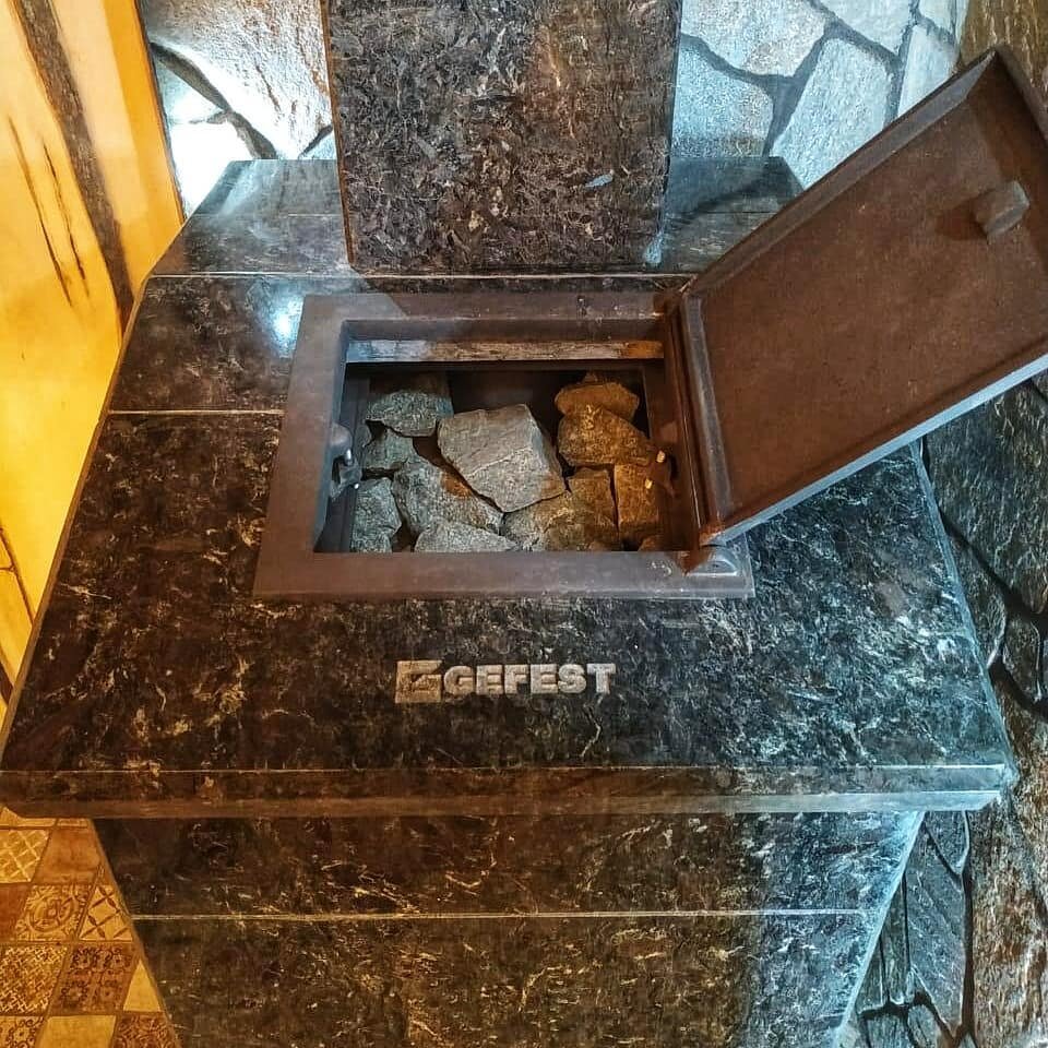 Парная с чугунной банной печью Гефест ПБ-03П-ЗК в облицовке из натурального камня Президент Серпентинит. Основное назначение облицовки – добавление возможности регулировать интенсивность нагрева воздуха в парной и сохранение полученного уровня влажности.