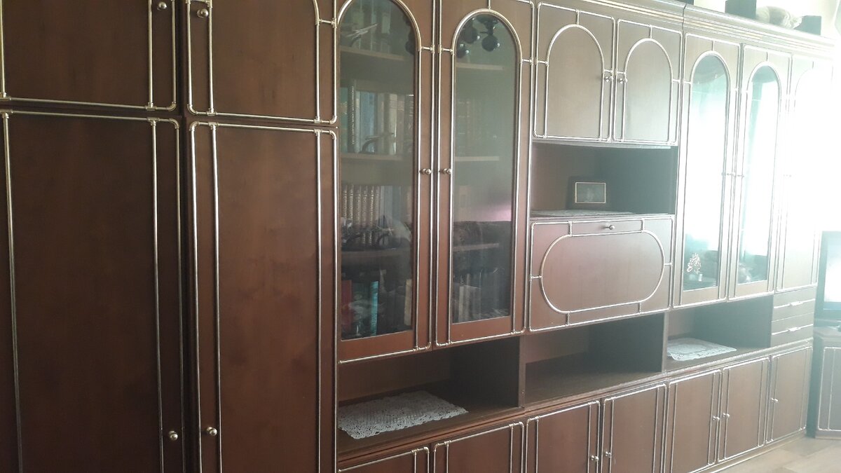 И вот, когда контейнер подвозили к дому, чтобы разгрузить его, я думала грузчики ее сломают и придётся ее выкидывать. Там, где сервант с посудой, разбились заркала, ходили заказывать новые. Но всё остальное было целое. И вот уже 19 лет, как она стоит уже в моей семье. А в целом ей уже, где-то 33 года. Она в прекрасном состоянии. И сколько бы я не искала, не могу найти пока ей замену.