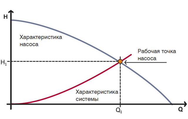 Система циркуляции (состоящая из труб или шлангов, перепадов высот, фильтра) создает сопротивление напору воды, для преодоления которого жидкостью совершается работа. Потеря напора в системе коррелирует с подачей. Их зависимость друг от друга называют гидравлической характеристикой системы. Рабочая точка Самой сложной для понимания, и в то же время самой важной, характеристикой является рабочая точка, которая обозначается как производительность (подача) насоса на определенном напоре. Что это значит? Производительность насоса - объем жидкости передаваемый насосом по трубам в единицу времени. Напор - удельная механическая работа передаваемая насосом жидкости. Зависимость этих двух величин друг от друга называют гидравлической характеристикой насоса. Точку пересечения этих двух зависимостей называют рабочей точкой системы — точкой равновесия между полезной мощностью насоса и мощностью, потребляемой водопроводной системой. В идеале, рабочая точка должна располагаться посередине гидравл