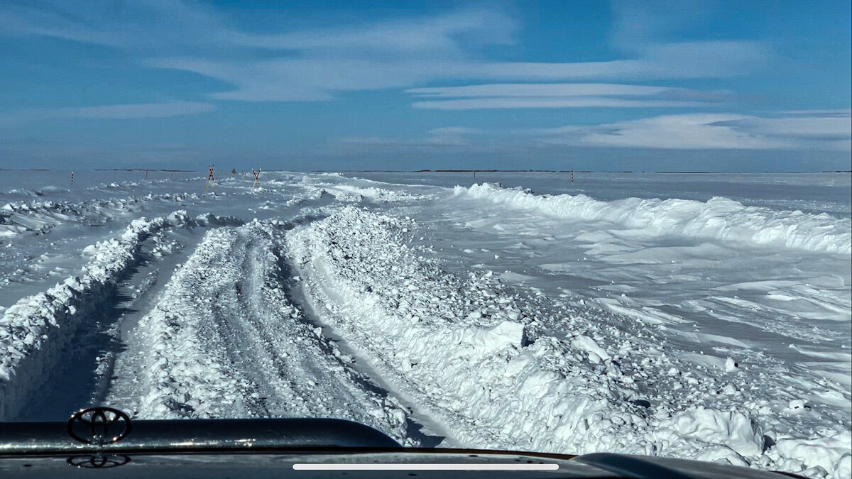 Наше полярное путешествие на Землю Ямала подходило к завершению. Мы думали, все приключения можно смело отложить в памятную коллекцию воспоминаний. Оказалось, что самый мощный адреналин получают на зимнике. Ямал не отпускает В конце апреля быстро теплело. Зимник становился талым. Буквально два дня до нашего выезда официально закрыли дорогу и, следовательно, перестали чистить. Нам предстояло выехать рано утром с Яр-Сале на Салехард, чтоб успеть на самолёт в Петербург. Мы смело отправились в дорогу с местным жителем Витей на его машине Toyota Prado 90 в сторону Панаевска. Дорога расстоянием всего 240 км, из них 180 км - по зимнику, но путь занял 9 часов. Зимник разбитый. Ехали медленно. Местами раскачивали машину и спокойно проезжали плохие участки. Тем временем пропускали все встречные машины по правилам зимника. Правило гласит: Кто едет на юг, пропускает того, кто едет на Север. Обычно на север направляются гружённые машины, например, с продуктами в тундру. После Панаевска в