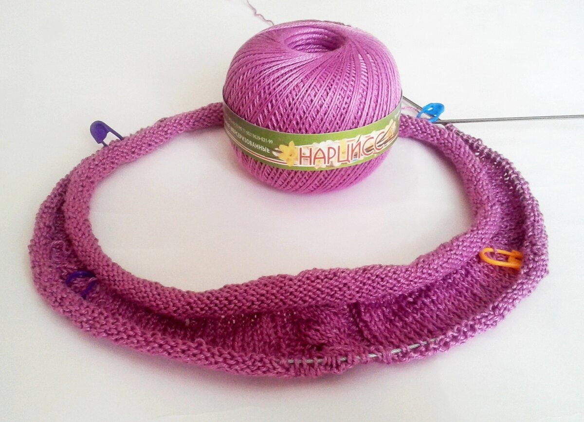 На днях начала вязать новинку. Моё будущее вязаное изделие - джемпер для весенней погоды. Начала вязать изделие и вспомнила, что меня спрашивали, как я рассчитываю петли для реглана сверху перед началом работы. В этой статье я пишу свой опыт, результат - мои изделия, которые я ношу с удовольствием. Возможно, делаю расчёт не совсем правильно, и неидеально. Но он прост и мне нравится, возможно, и вам пригодится. Это изделие я вяжу из 100% мерсеризированный хлопковой нитки "Нарцисс" отечественного производства . В ста граммах 395 метров, приобрела десять моточков. Думаю, что для джемпера будет достаточно, в крайнем случае придётся докупать. Начала вязание со ста пятидесяти (150) петель. Вяжу спицами № 2. Желательно вязать двумя круговыми спицами, так удобнее вязать по кругу. Цвет нитки выбрала нежный сиренево-розовый. На фотографии цвет немного искажается, и я - фотограф самый крутой в мире! Недавно закончила вязать кардиган из верблюжьей полушерсти и тоже начинала работу со 15