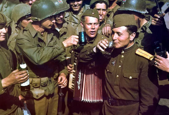 Встретились. Стали носить белые повязки и белое на голове, на машины вешали белые флажки. На технике белые полосы малевали. Американцы так же поступали. Среди них много канадцев украинского происхождения было, мы общались. Мы по-солдатски выпивали, угощали друг друга. Обнимались и хлопали друг друга. Водка им понравилась. Виски нам нет. Так где-то два дня продолжалось.