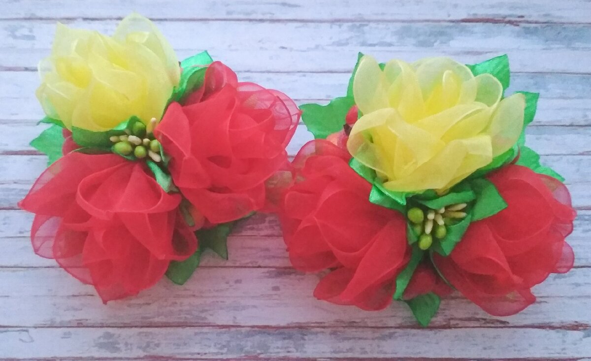 Для создания украшения понадобится: Отрезок органзы 4х8 см. Прошиваем, складывая таким образом в треугольник. Стягиваем нить, закрепляем. Получается лепесток. На один цветок потребуется 10 лепестков. 5 обычных, 5 с заостренными краями (необязательно). Заостренный край делаем с помощью зажигалки. Берем проволоку. Можно обычную. Тейпировать не обязательно. Вклеиваем проволоку на край лепестка. Склеиваем лепесток, заворачивая. Далее клеим следующий. Первые 5 лепестков приклеены. Все 10 лепестков приклеены. Из квадрата ленты 5х5 см вырезаем чашелистик. На 1 цветок нужно 2 шт. Клеим, закрывая низ. Второй чашелистик клеим в шахматном порядке. Для одной резинки делаем 3 розочки. Склеиваем их между собой. В серединку вклеиваем букет тычинок. Между розами вклеиваем произвольное кол-во ягод. Вырезаем готовые листочки, обрабатываем края зажигалкой, делая их волнистыми. Закрываем листочками ягоды. Затем вклеиваем еще слой листочков. Приклеиваем основу - резинку (заколку). Вот такой воздушный бу