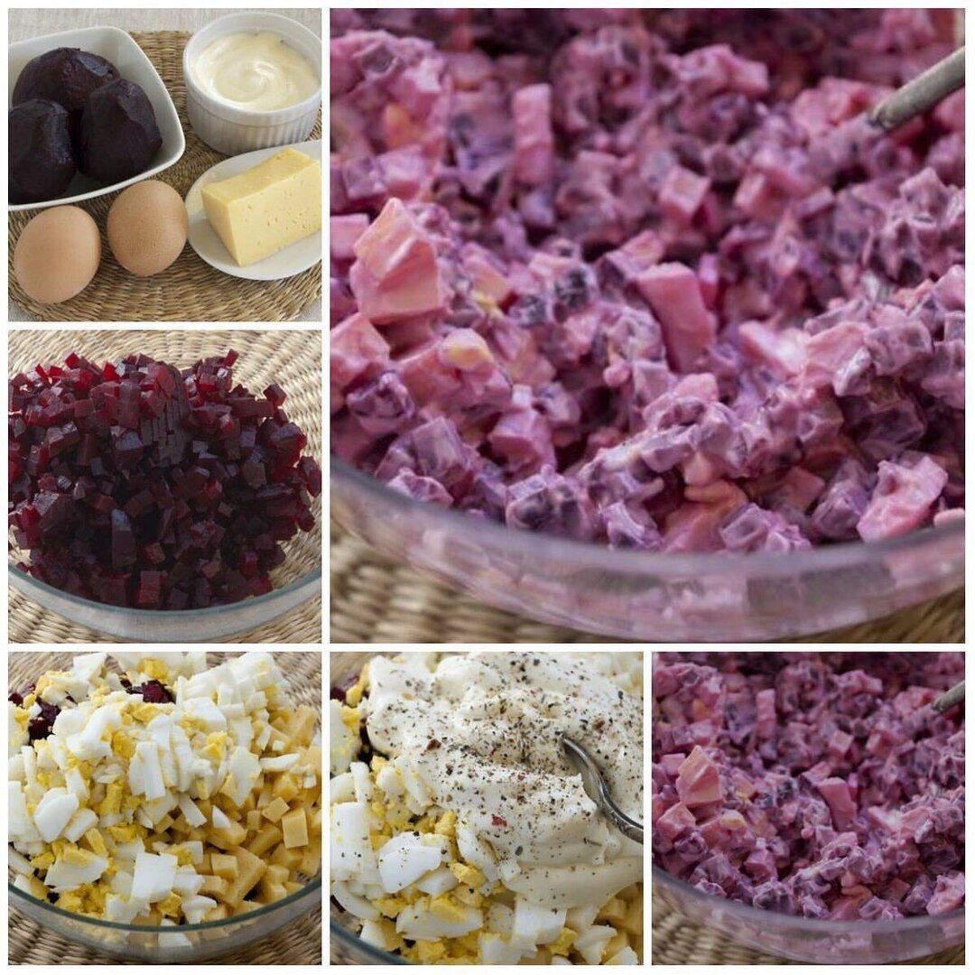 Легкий свекольный салатик, совсем несложный в приготовлении, порадует как на будничном столе, так и на праздничном. Его можно приготовить, украсив при подаче. Ингрелиенты: Свекла 300 г Яйцо куриное 2 шт Сыр твердых сортов 80 г Майонез 3 ст.л. Соль 1 щеп. Смесь перцев 1 щеп. Способ приготовления: 1. Для приготовления салата нужны: отварная свекла (темно-бордовая, сладкая), отварные яйца, сыр твердый, немного майонеза, соль и пряности по вкусу. Салат в приведенной интерпретации является достаточно нейтральным по вкусу. Его можно разнообразить, если добавить: - немного измельченного чеснока; - нарезанный кубиками маринованный огурчик; - толченые грецкие орехи; - смешанный с горчицей майонез. 2. Очищенную отварную свеклу нарезать небольшими кубиками, поместить в салатник. 3. Сыр и очищенные яйца нарезать также небольшими кубиками. Добавить их в салатник к свекле. 4. Посолить салат, заправить майонезом, приправить пряностями по вкусу. 5. Перемешать салат. Подавать можно ср