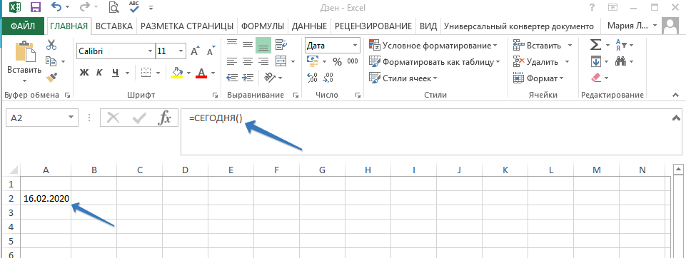 - функция СЕГОДНЯ, которая выводит сегодняшнюю дату (согласно данным на устройстве, т.е. учитываются региональные параметры). Попробуйте использовать функцию СЕГОДНЯ, которая выводит сегодняшнюю дату. Это динамическая функция, поэтому если вы откроете книгу завтра, дата изменится. Введите =СЕГОДНЯ() .