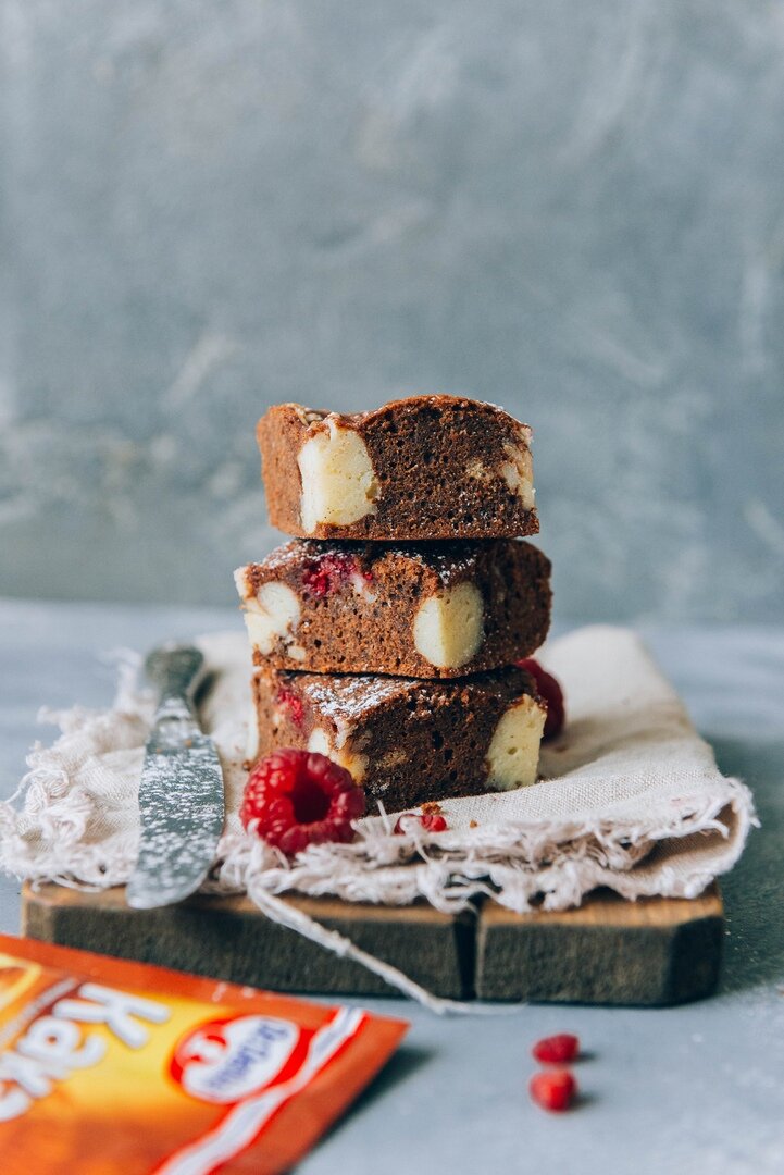 • Малина - 100 г 👉 Способ приготовления: ① Сливочное масло топим в микроволновой печи. ② Отдельно смешиваем яйца, сахар и взбиваем до светлой пены. ③ Вливаем охлажденное масло и снова аккуратно перемешиваем. ④ Всыпаем муку, какао и перемешиваем лопаткой. ⑤ Отдельно взбиваем творожный сыр, пудру и муку до однородного состояния. ⑥ Духовку разогреваем до 170 градусов. ⑦ Небольшой противень застилаем пергаментом, выливаем шоколадное тесто, локально выкладываем сливочную массу и малину. ⑧ Выпекать около 40-45 минут. ⑨ Готовый брауни нарезаем на квадратики, по желанию п