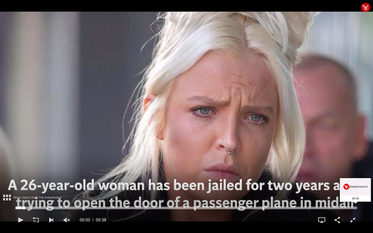 26-летняя женщина осуждена к 2-м годам лишения свободы после попытки открыть дверь пассажирского лайнера во время полёта. Хлоя Хейнс была признана виновной в суде Короны Челмсфорда в среду за угрозу безопасности самолета и нападение на члена экипажа. Инцидент произошел на борту самолета Jet2 в июне прошлого года (рейс в Даламан) Самолет был вынужден вернуться в Великобританию, когда Хейнс попыталась открыть дверь, вынудив ВВС взломать два самолета Eurofighter Typhoon, чтобы перехватить этот.