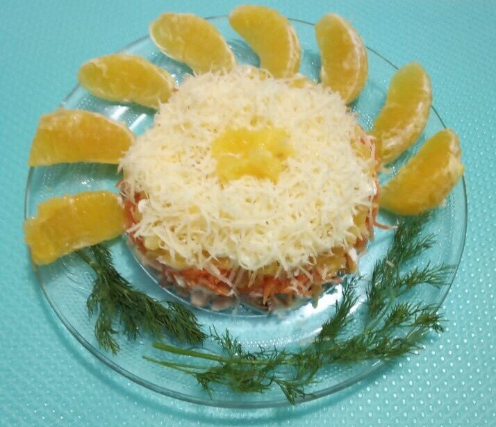 - Салат выкладываем слоями: Сначала курица, затем морковь по корейски, затем апельсин, затем яйца и последний слой сыр.
