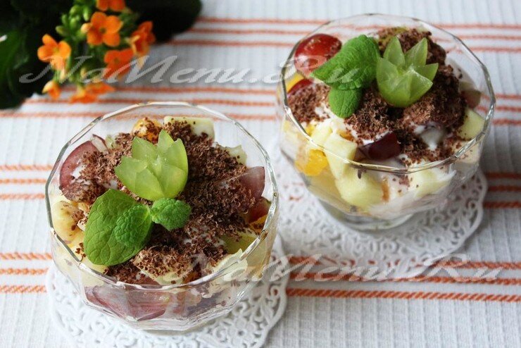 🍧Фрукты выложить в креманки, полить йогуртом и присыпать шоколадом
