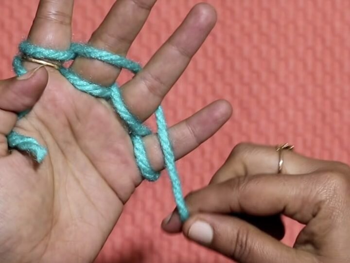 Как сделать Прижмите кончик пряжи. Наберите ее вокруг пальцев в шахматном порядке. Сделайте два ряда петель.