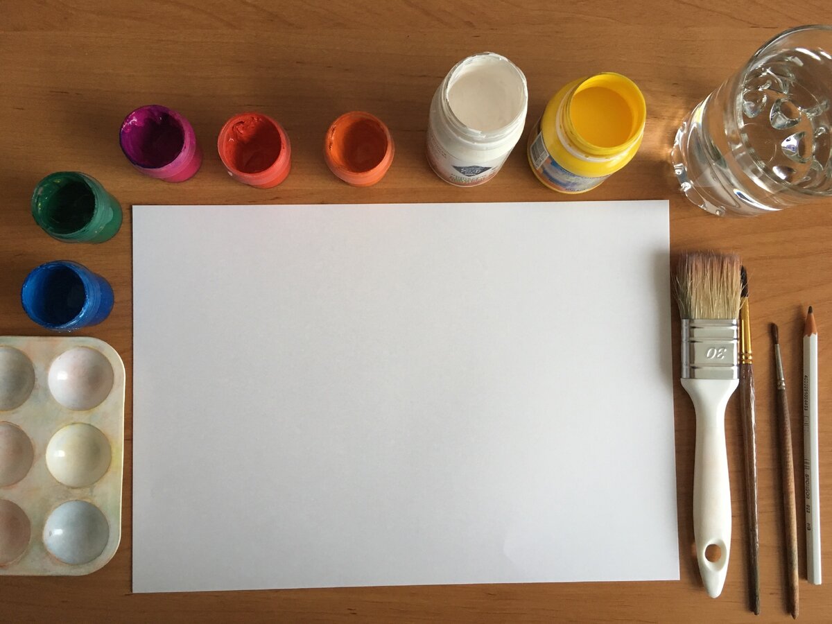 Этот мастер-класс познакомит детей с таким жанром живописи, как натюрморт. Необходимые материалы: -лист плотной бумаги А4; - простой карандаш; - краски (гуашь); - кисти щетинная (30), белка или синтетика №4, №2; - палитра; - вода. Лист располагаем горизонтально. Проводим линию горизонта, чтобы отделить стол от стены. Закрашиваем фон, начинаем со стены, она будет в холодных тонах. Для этого используем щетинную кисть, сначала проводим несколько вертикальных линий синего цвета на всю ширину кисти. Затем на палитре смешиваем синюю и белую гуашь, получаем голубую, проводим линии голубого цвета внахлёст с синими. Теперь на палитре смешиваем зелёную и белую гуашь, проводим линии внахлёст с голубыми. К полученному на палитре светло- зелёному цвету, добавляем синюю и проводим этим цветом последние линии. Теперь нарисуем скатерть на столе, она будет более тёплых оттенков. Для этого смешаем на палитре красную и белую гуашь. Горизонтальными мазками закрасим стол. Далее нарисуем жёлтую (или друго