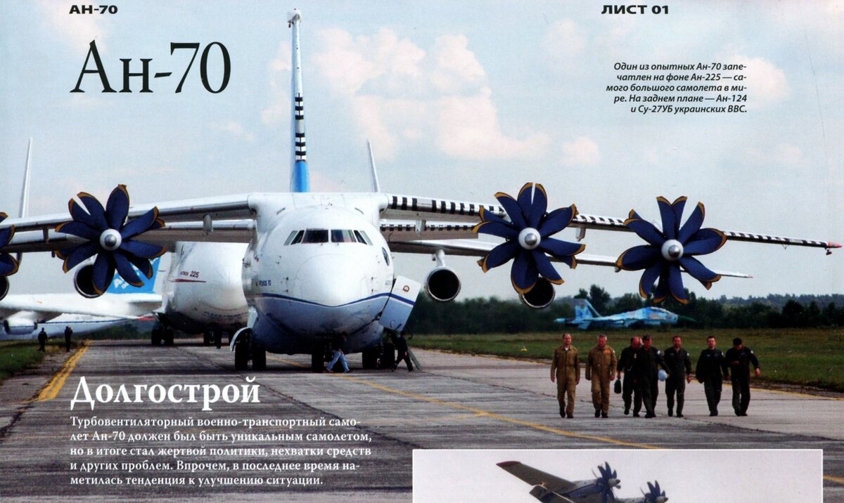 Всем привет! Сегодня мой рассказ будет об еще одном самолете от КБ имени Антонова. Итак, встречайте, советско-украинский военно-транспортный самолет Ан-70. История нашего лайнера началась в далеком 76 году. Тогда было сформировано техническое задание на проектирование новой машины, но несмотря на это требования к характеристикам к новой машине постоянно пересматривались и окончательный вариант машины был утвержден только в 1986 году прошлого века. Через пять лет на авиазаводе в городе Киев заложили первый прототип, но к сожалению после распада Советского союза продолжение работ было приостановлено. Самолет по видимому был нужен и России, именно поэтому летом 93 года Украина и Россия подписали соглашение о сотрудничестве в обеспечении создания и совместного серийного производства нового авиалайнера. К слову, самолет планировалось оснастить двигателями Д-27. Первый полет у машины состоялся в декабре 1994 года. Полет проходил под командованием С. Максимова. После контрольной пробеж